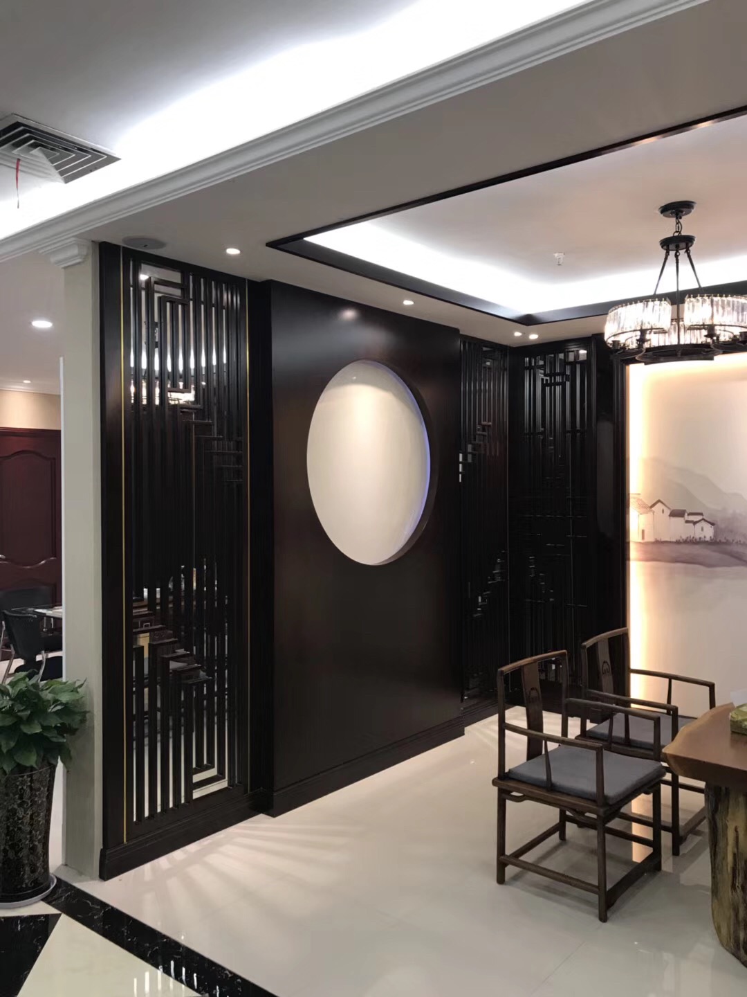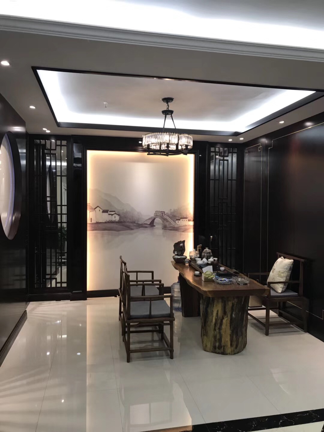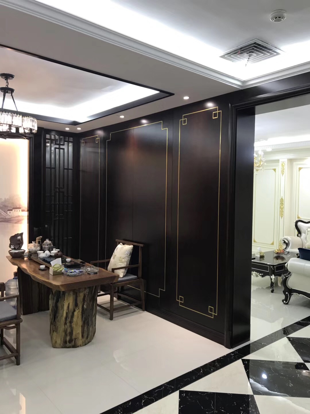 深灰色的木皮整體的感覺更加的低調和優雅,有著中式的內斂含蓄之感。亮光漆的運用,一方麵可以提升空間亮度,削弱灰色帶來的沉悶壓抑,另一方麵也增加了整個設計的時尚度。